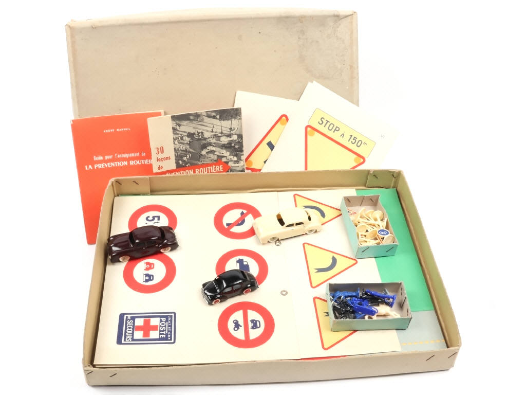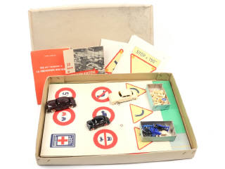 avec ses 3 voitures - états 'A' & 'A-' - contient : 2 RENAULT FREGATE de marque MINIALUXE, 4cv de marque C.I.J., 15 accessoires de signalisation, 9 figurines, 2 manuels & 26 planches cartonnées (tapis de jeux & différents accessoires) - quelques petites taches par endroits (plus importantes sur le coffret, étiquette incomplète)