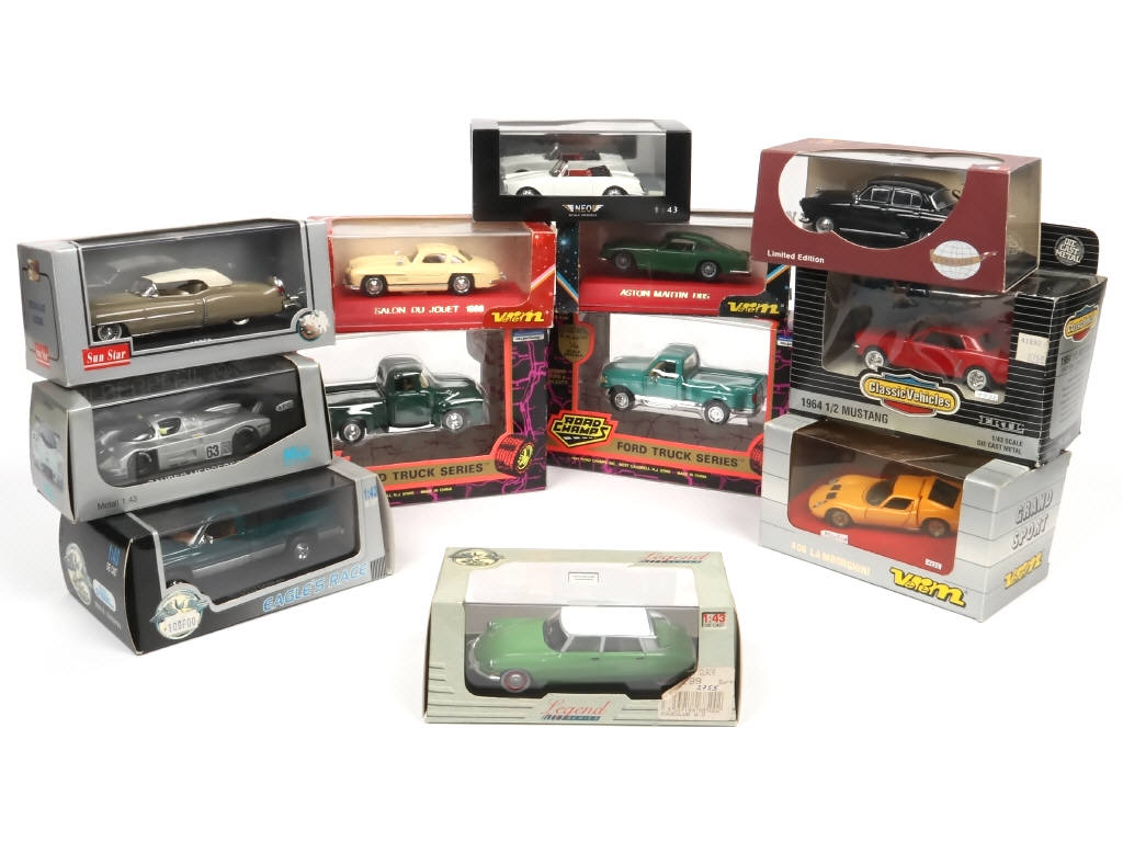 comprend notamment les modèles : ASTON MARTIN, DODGE, MERCEDES & FORD - on y retrouve les marques : ROAD CHAMPS, VEREM, ERTL, UNIVERSAL HOBBIES & MODELS MAX - quelques accrocs sur certaines boites