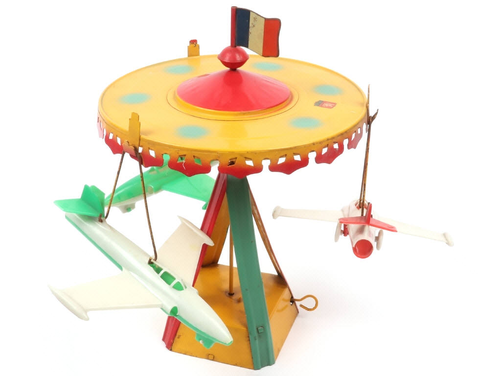 J.M.L. JOUETS MAGNIN - LYON (FRANCE) Manège en tôle peinte jaune, rouge & bleu