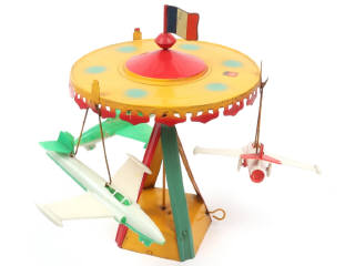 dimensions : 36 x 25 cm - moteur à ressort (fonctionne) - avec 3 avions en plastique (2 flèches manquantes) - quelques petites traces d'oxydation avec légères déformations par endroits
