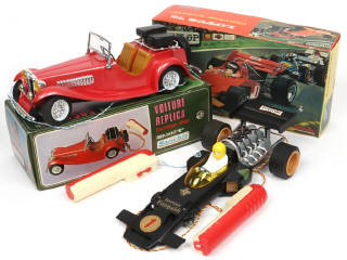 longueur 31,5 cm - avec moteur à piles (fonctionne), 3 bagages & cale de boîte - on y joint une LOTUS F1 téléguidée de la marque en état 'B'-'b' avec train avant cassé (non testée, roues présentes) - quelques parties déformées sur les boîtes