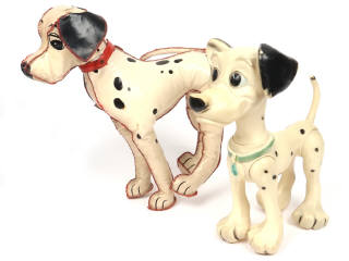 à l'effigie des chiens du dessin animé de Walt Disney 'LES 101 DALMATIENS' - réalisations en caoutchouc & plastique - hauteurs : 32 & 37 cm - bruiteurs de pattes d'un exemplaire à revoir & vinyl plus ou moins craquelé sur l'autre