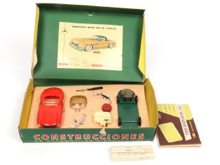 échelle 1/32ème - dimensions du coffret : 30 x 21 cm - contient : carrosserie, vitrage, aménagement intérieur, pare-chocs avant & arrière, châssis (avec moteur à friction non testé), tournevis & notices - ensemble présenté sur socle de présentation avec élastiques de maintien dont certains séchés, incomplets ou manquants - coffret plus ou moins déformé, encrassé avec 2 petits manques de papier