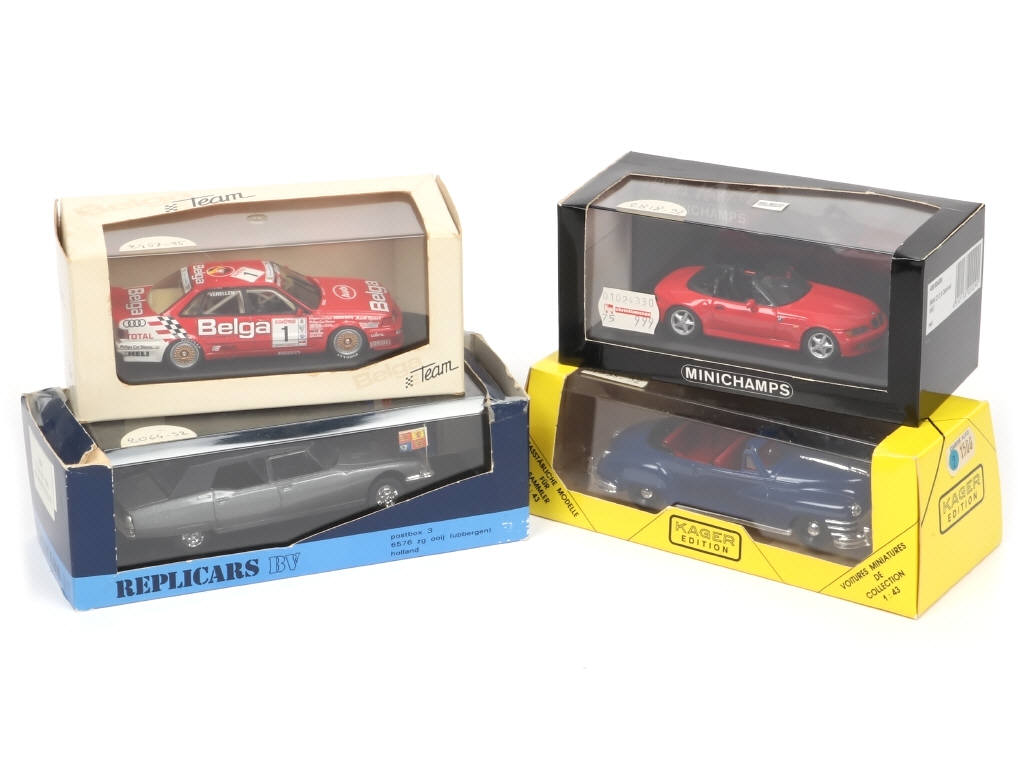 comprend : BMW Z3, CITROEN SM PRESIDENTIELLE, AUDI QUATTRO & CHRYSLER WINDSOR - on y retrouve les marques : MINICHAMPS, KAGER EDITION & REPLICARS - quelques accrocs sur les suremballages & certains en état 'c'