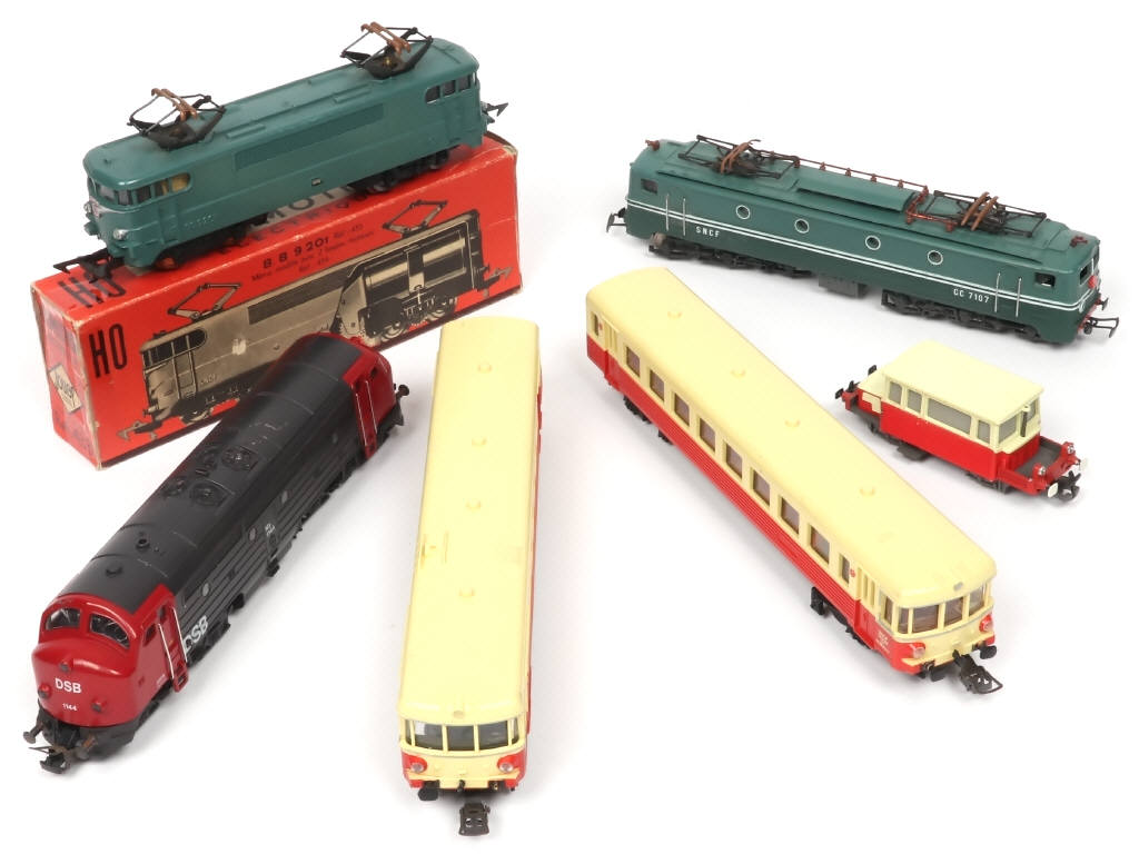 non testé - comprend : motrice électrique CC 7107 (un vitrage désolidarisé), BB 9201 (quelques petits frottements, en boîte état 'c'), autorail 2 éléments X 4308 (un tampon cassé & manquant), motrice diesel 1144 (frottements) & 471 (état 'C', parties cassées & manquantes) - on y retrouve les marques : FLEISCHMANN & JOUEF - quelques petites traces d'oxydation par endroits