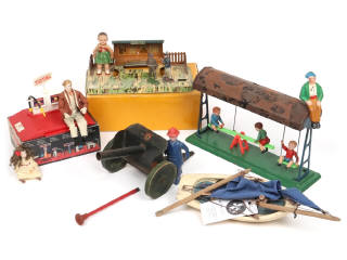 différentes compositions - comprend notamment : pompe à essence (fonctionne), balançoire à moteur (à revoir), voilier, canon & gare - on y retrouve notamment les marques : MONT BLANC, JEP, QUIRALU & J.G - avec quelques manques, parties cassées & non conformes - boites en état ' b'