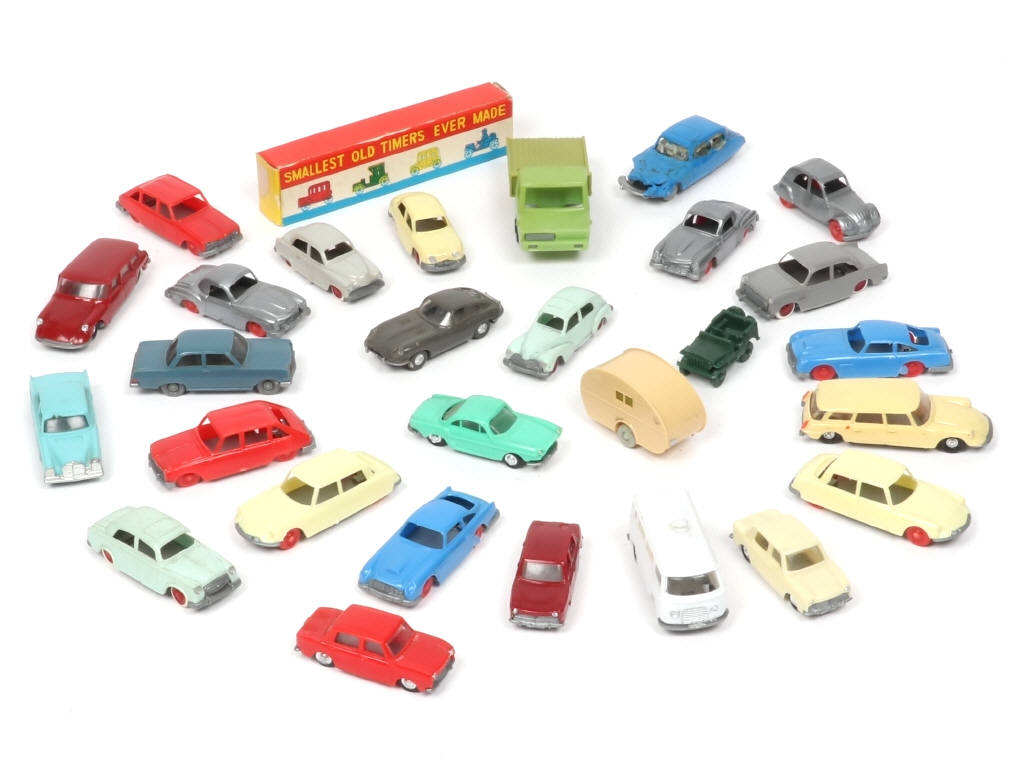 petites échelles - miniatures reproduisant notamment les modèles : CITROËN, MERCEDES, SIMCA & JAGUAR - on y retrouve notamment les marques : JOUEF, EKO & WIKING - 4 véhicules en boîte - avec manques, parties cassées & fondues