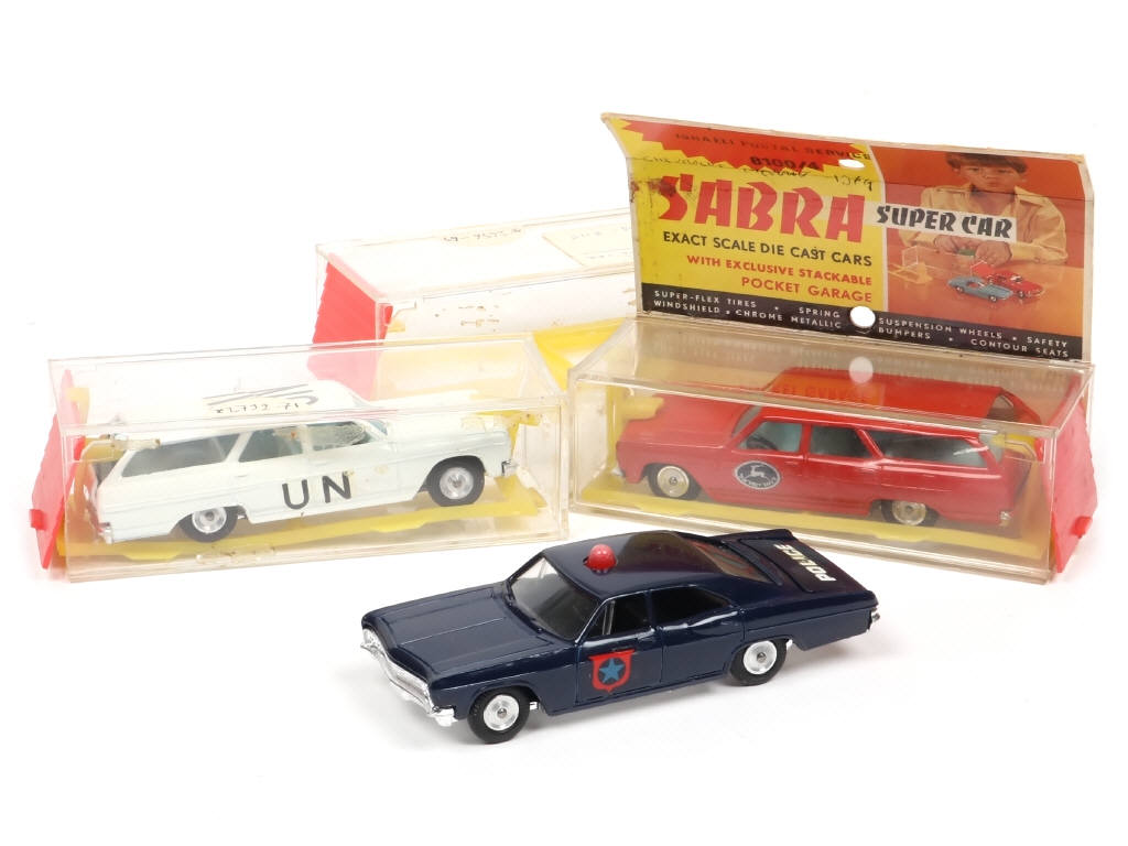 comprend les modèles : CHEVELLE STATION & POLICE CAR (gyrophare légèrement opacifié) - on y joint une CHEVROLET CHEVELLE STATION de la marque GAMDA KOOR - boites en état 'b' (2 supports cartonnés manquants - étiquettes collées)