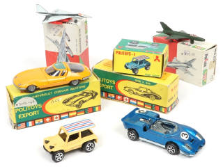 comprend les modèles : CHEVROLET CORVAIR BERTONE, GHIA V.280, DUNE BUGGY, MIG 21C (un missile incomplet) & HUSTLER B58 - on y retrouve les marques : POLITOYS & POLISTIL - boites en état 'b' avec quelques accrocs & étiquettes collées