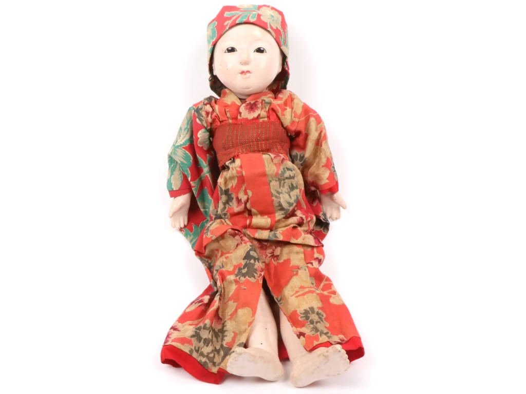 taille : 45 cm - tête & corps en composition & tissu - mécanisme parleur à revoir - yeux noirs en sulfure fixes - visage peint - vêtements traditionnels d'origine