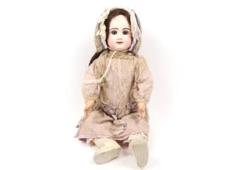 taille : 56 cm - marquages en creux à la nuque : R 2 D - tête en biscuit - yeux bleus en sulfure fixes - bouche fermée - oreilles percées - corps articulé en composition (quelques éclats sur les doigts) - perruque brune en mohair, avec calotte d'origine - vêtements anciens