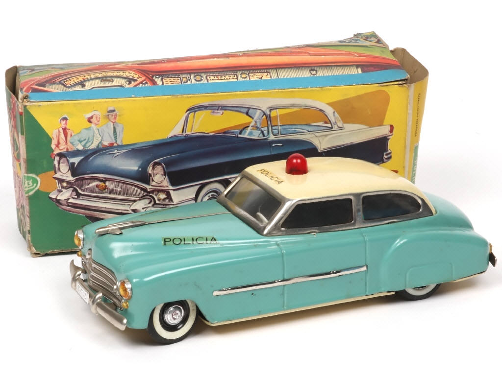 longueur 25 cm - avec moteur à piles, gyrophare lumineux (non testés, avec ampoule) & direction - quelques petites traces d'oxydation dans le compartiment à pile - ensemble plus ou moins encrassé (principalement la boîte, endommagée)