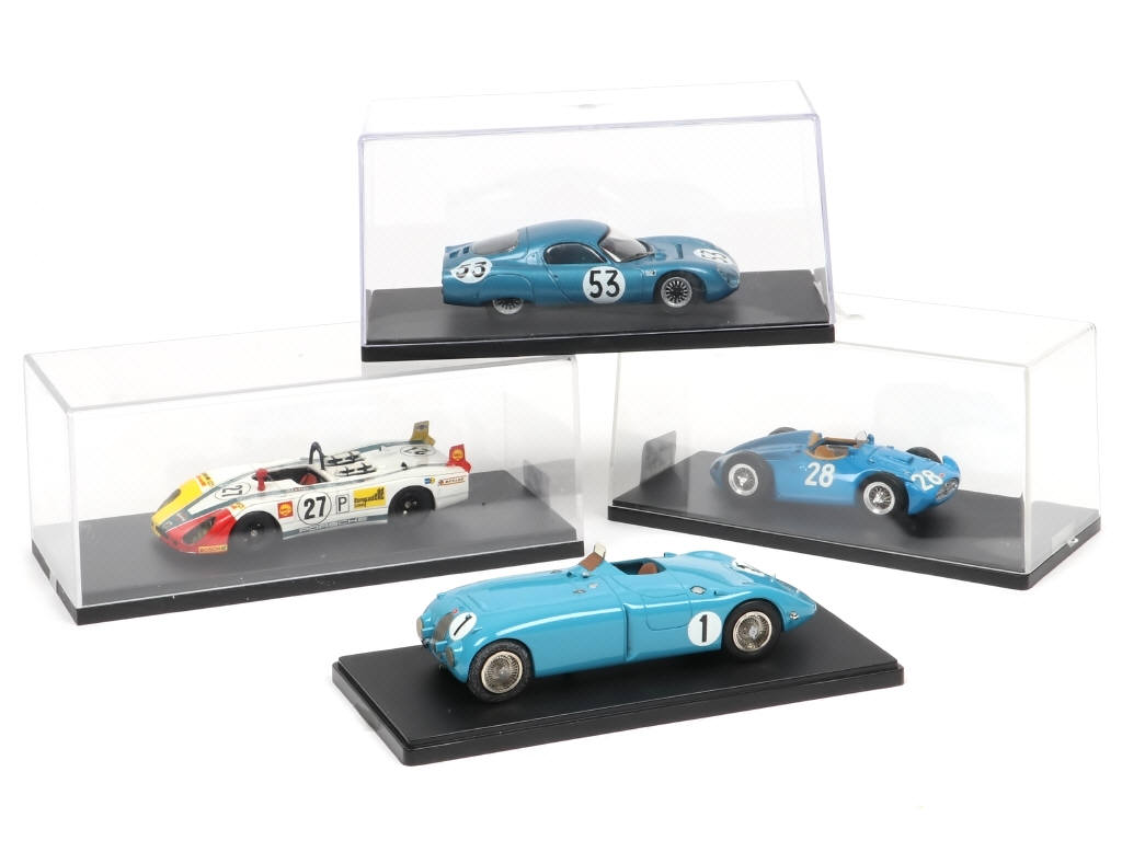 comprend les modèles : BUGATTI 57C Le Mans 1939, 251 Grand Prix REIMS 1956, PORSCHE 908.2 Le Mans 1970 & CD PEUGEOT Le Mans 1966 - on y retrouve les marques : JPS & STARTER - boites non conformes