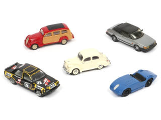 fabrications résine & métal - comprend notamment les modèles : SAAB, PANHARD, BUGATTI & PEUGEOT (manque une extrémité de pare-chocs) - on y retrouve les marques : TOP 43, RECORD, GRAPHYLAND, CCC & JAB-TOYS - petits manques sur certains modèles