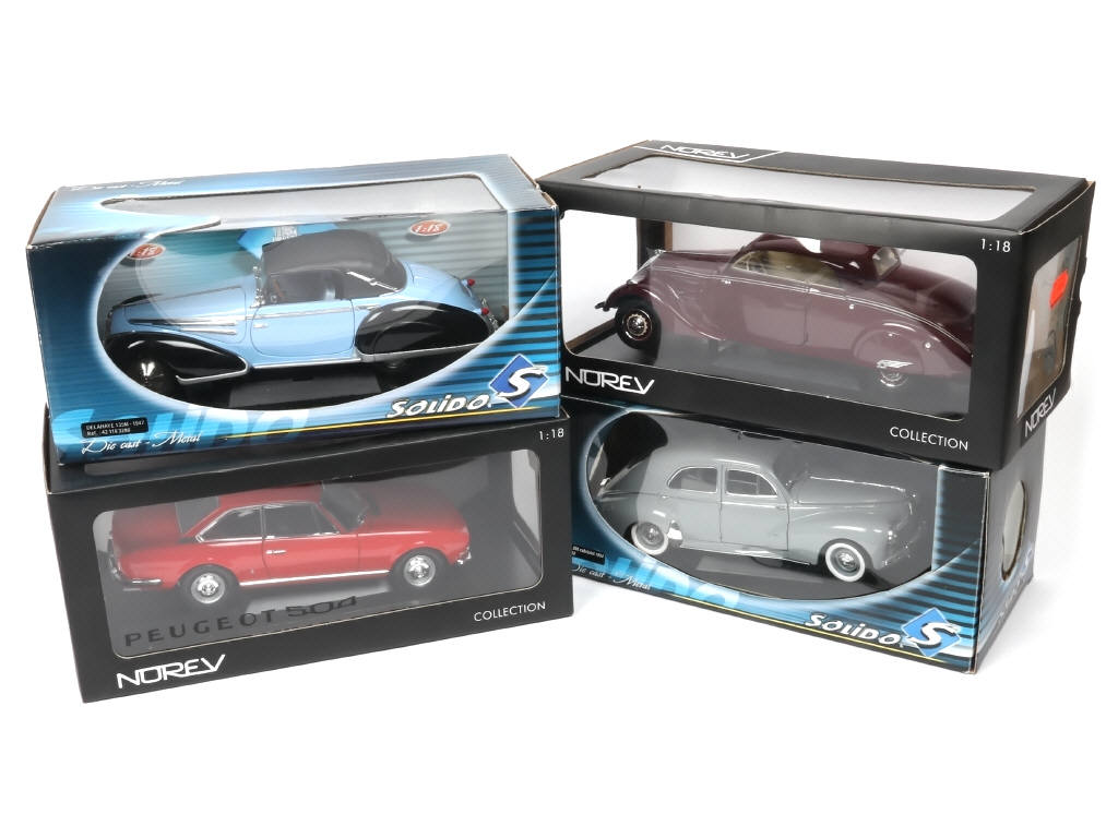 échelle 1/18ème - comprend : PEUGEOT (3 exemplaires différents) & DELAHAYE - on y retrouve les marques : SOLIDO & NOREV - quelques accrocs avec certains blisters décollés sur les boîtes