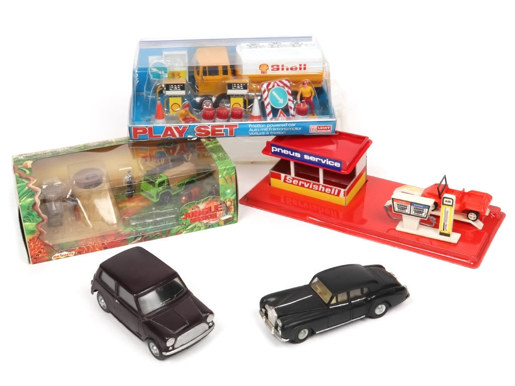 comprend notamment les modèles : ROLLS ROYCE (non testé - quelques éléments déformés & non d'origine), MINI (moteur à friction fonctionnel - roues non d'origine) & MERCEDES - on y retrouve notamment les marques : KN & MAJORETTE - 3 modèles en boite états 'b' & 'c'