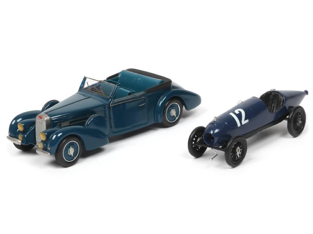 comprend les modèles : T57 C cabriolet 1938 & T30 Grand prix de Strasbourg 1932 - on y retrouve les marques : HECO MODELES & MCM - quelques petits accessoires manquants, recollés & retouchés