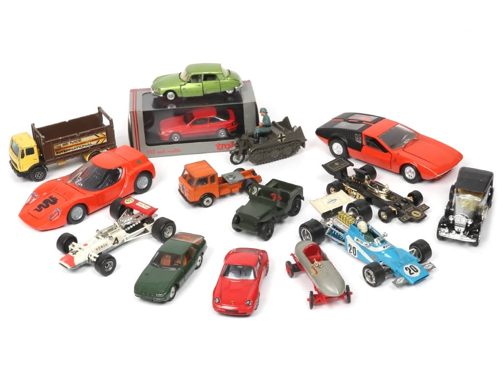 différentes échelles - miniatures reproduisant notamment les modèles : PORSCHE, CITROËN & DE TOMASO - on y retrouve notamment les marques : POLITOYS, NOREV, MAJORETTE & TROFEU (en boîte état 'c') - avec manques & parties cassées (plus ou moins importants suivants les modèles)