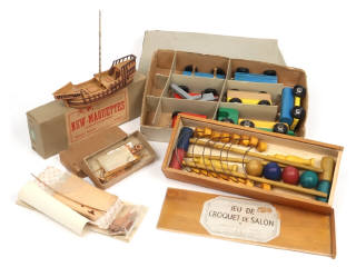 comprend notamment : croquet de salon, maquette de bateau 'SANTA MARIA' (à finir) & train à traîner - avec quelques manques & parties cassées - boites en états 'b' & 'c'