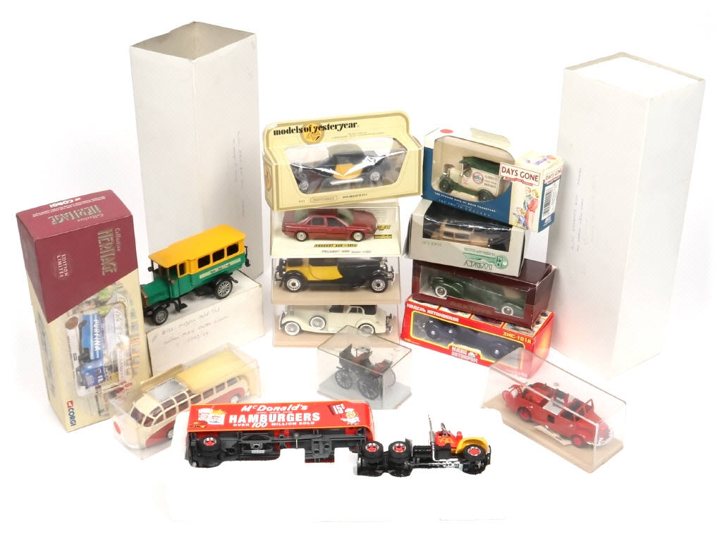 comprend notamment les modèles : SIMCA, MAN, BUGATTI, CADILLAC & KENWORTH - on y retrouve notamment les marques : WIKING, SOLIDO, RIO, CURSOR MODELL, CORGI, MATCHBOX, REXTOYS & ZISS MODELL - avec manques & parties cassées sur certains modèles - boites en états 'b' & 'c'
