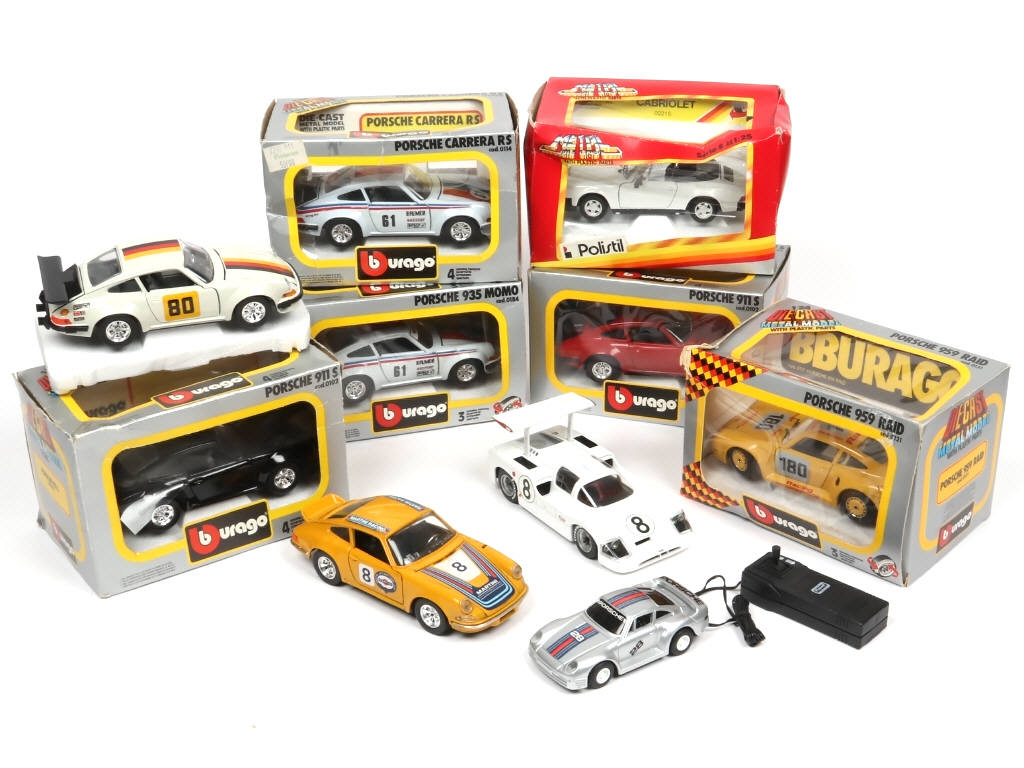 9 exemplaires à échelle 1/24ème - un modèle téléguidé non testé - comprend notamment les modèles : 959 RAID, 911 S & CARRERA RS - on y retrouve notamment les marques : BBURAGO & POLISTIL - petits manques & parties à recoller sur 2 exemplaires - boites en états 'b' & 'c'