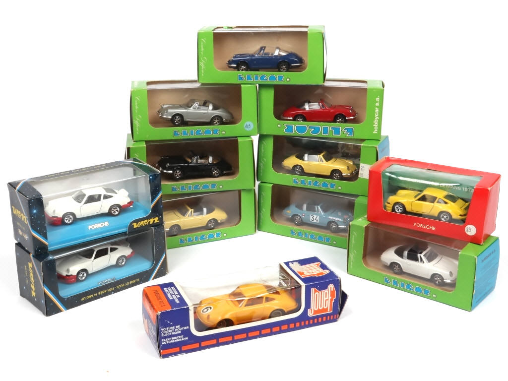 comprend principalement le modèle 911 TARGA - on y retrouve les marques : ELIGOR (possibilité de boites non conformes), VEREM & JOUEF (SLOT CAR - non testé) - quelques boites avec petits accrocs & certains blisters légèrement abîmés