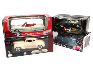 échelle 1/18ème - comprend les modèles : PLYMOUTH, CADILLAC, OLDSMOBILE 1950 'GREASE' (une extrémité de baguette latérale à recoller) & JAGUAR - on y retrouve les marques : ANSON, ROAD SIGNATURE, BBURAGO & AUTO WORLD - quelques petits accrocs sur les boites dont une avec un blister déchiré
