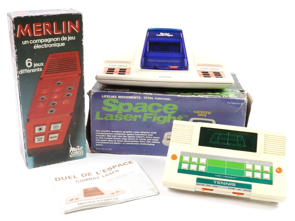 année 1979 - fonctionnel - notice & cache piles présents - plastique légèrement jauni avec légers frottements par endroits - boite en état 'c' (manques de papier & déchirures) - on y joint les jeux : TOMYTRONICS (fonctionnel, état 'B') & MERLIN (à revoir - état 'A-.b')