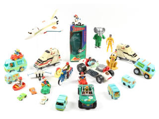 comprend notamment : TRANSFORMERS, GHOSTBUSTER, SCOOBY DOO, DISNEY, THUNDERBIRD - on y retrouve les marques : HASBRO, FIZZY, BANDAI & KENNER - avec manques & parties cassées