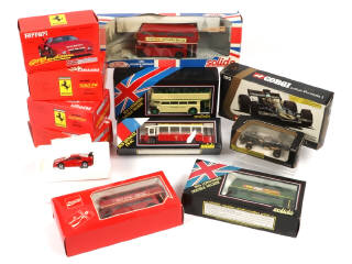 comprend les marques : SOLIDO, CORGI & JOUEF EVOLUTION - miniatures reproduisant notamment les modèles : FERRARI, RENAULT TN 6C & DOUBLE DECKER - différentes échelles - boîtes en état 'a à b'