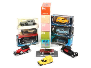 comprend notamment les modèles : LANCIA, PEUGEOT, HISPANO-SUIZA & CHEVROLET - on y retrouve notamment les marques : SOLIDO, RIO & ELIGOR - possibilité de petits accessoires manquants