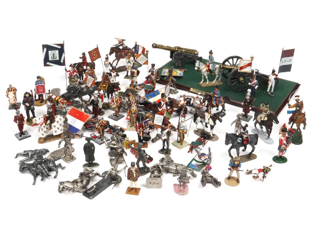 différentes compositions - comprend notamment : Napoléon, Tambours, Porte-étendards, Croisés, soldats du Premier Empire & canons - on y retrouve les marques : C.B.G (HACHETTE), Manufacture Historique des Soldats de Plomb (CHINE) & DEL PRADO - avec petits manques & parties cassées