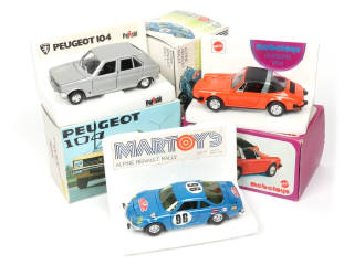 échelle : 1/25ème - miniatures reproduisant les modèles : PEUGEOT, PORSCHE & ALPINE - on y retrouve les marques : POLISTIL, MARTOYS & MEBETOYS - quelques accrocs sur les boîtes