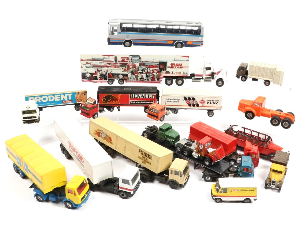différentes échelles - comprend notamment les marques : NOREV, CONRAD, NZG, SOLIDO & CORGI - carrosseries encrassées - possibilité de petits manques & parties cassées