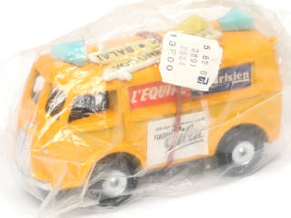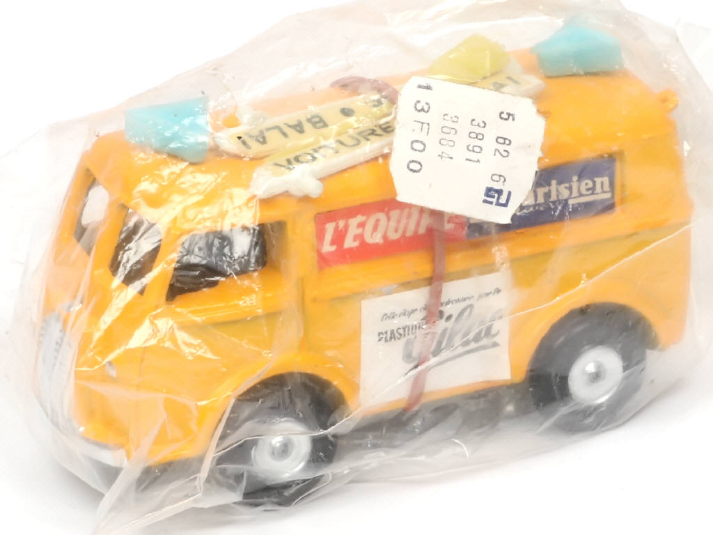 version avec plancher en plastique noir - publicités 'PLASTIQUE GILAC - L'EQUIPE & LE PARISIEN' - avec balai - sous sachet d'origine - traces d'oxydation sur un axe de roues