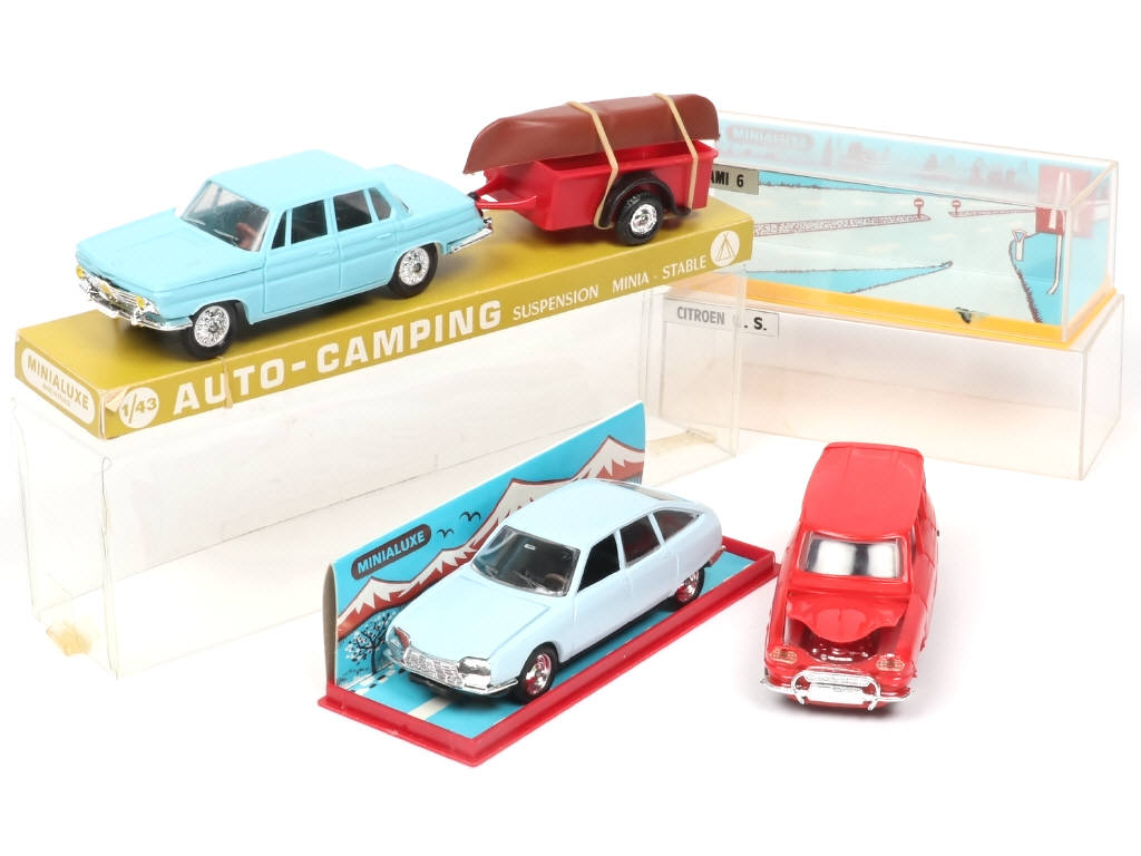 contient : BMW 1500 (carrosserie légèrement déformée) & une remorque à un essieu avec canoë - on y joint une CITROËN AMI 6 break (état 'A-', jantes fondues) & GS (une fêlure sur la boîte) de la marque