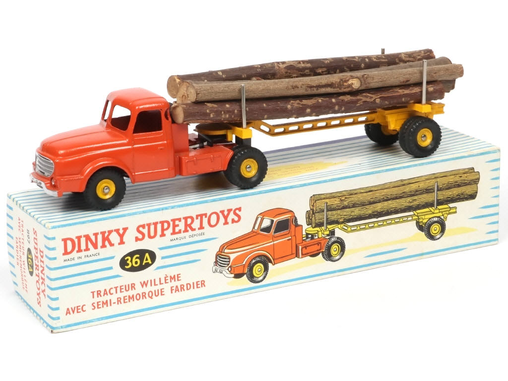 DINKY TOYS (FRANCE) 897 WILLEME Fardier (version avec jantes concaves & remorque ajourée) orange & jaune