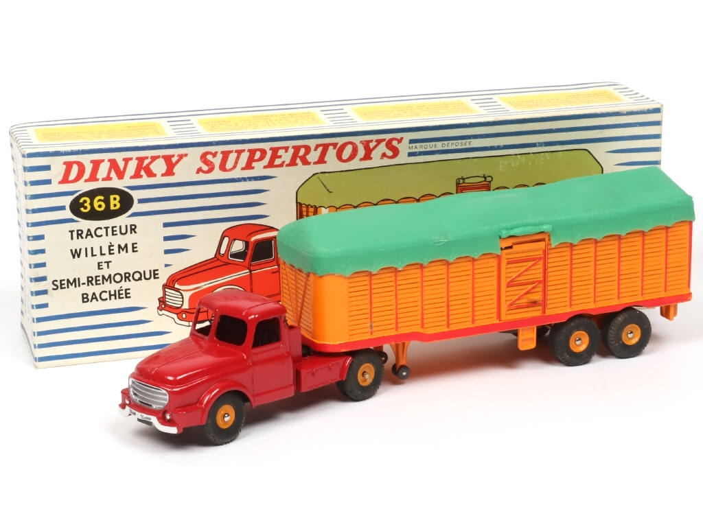 DINKY TOYS (FRANCE) 896 WILLEME Semi-remorque bâché (version avec jantes concaves) rouge & orange, bâche verte
