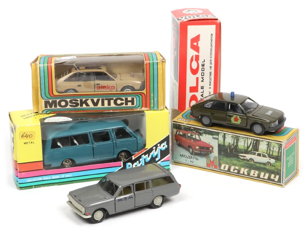 comprend les modèles : RAF, MOSKVITCH & VOLGA - métal fatigue sur un exemplaire - on y retrouve notamment la marque SARATOV - boites en états 'b' & 'c'