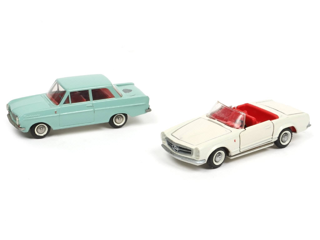 comprend : MERCEDES 230 SL (carrosserie cintrée & pare-brise cassé - manque un habillage de portière) & OPEL KADETT (métal fatigue avec manques de matière sur la malle arrière) - pneus séchés