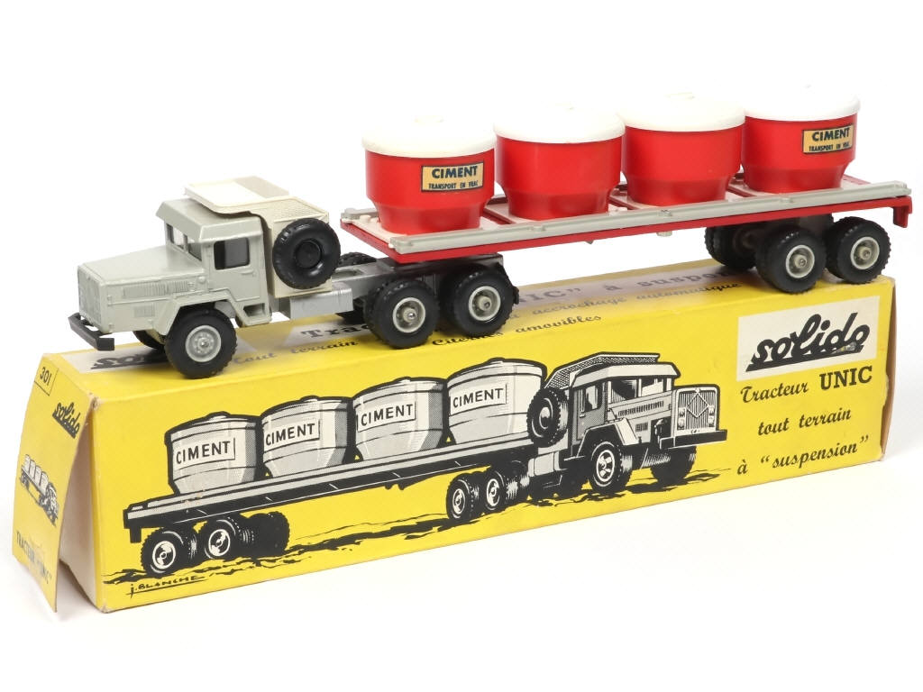 SOLIDO (FRANCE) 301 UNIC Semi-remorque plateau transport de ciment gris, blanc & rouge
