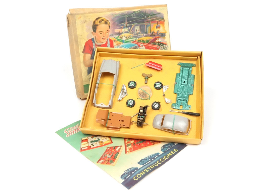 dimensions du coffret : 25 x 21 cm - contient : une carrosserie de voiture (en 2 parties), plancher, moteur à clef (non testé), 4 roues (traces de métal fatigue sur les jantes), une calandre/pare-choc, pare-choc arrière, une banquette (un exemplaire manquant), un aménagement intérieur, un tournevis, un dépliant, un axe, une boîte de fixations & une clef (traces d'oxydation) - avec socle de présentation & élastiques de maintien - ensemble plus ou moins encrassé & taché