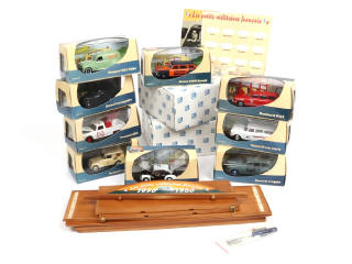 collection 'LES PETITS UTILTAIRES FRANCAIS 1950 - 1960' comprend les modèles : PEUGEOT, PANHARD, SIMCA & RENAULT - étagère à monter (semble complète - état 'B') - avec suremballage cartonné & un support de présentation en carton