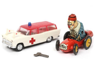 comprend : SIMCA MARLY ambulance (état 'A', avec brancard) & BIMBO (état 'B', moteur à clef fonctionne, avec une clef, quelques petites retouches & traces d'oxydation par endroits) - on y retrouve les marques : MINIALUXE & JOUSTRA