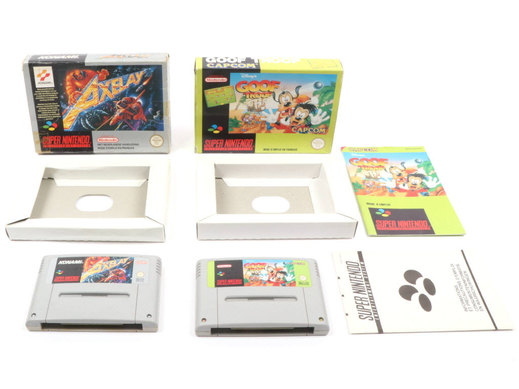 testé (fonctionnent) - comprend : AXELAY (mode d'emploi manquant) & GROOF TROOP (avec mode d'emploi) - boites avec accrocs, déchirures & traces de ruban adhésif