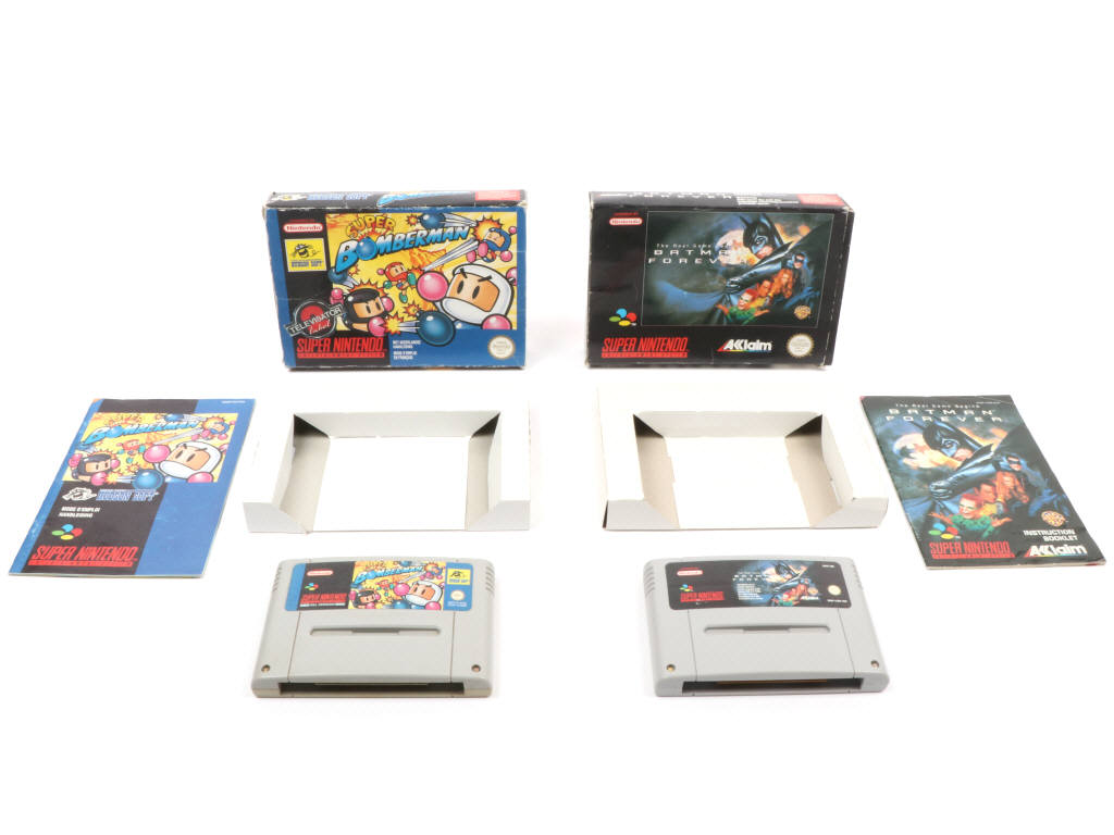 testé (fonctionne) - comprend SUPER BOMBERMAN & BATMAN FOREVER - manques de papier, déchirures & accrocs - avec mode d'emploi