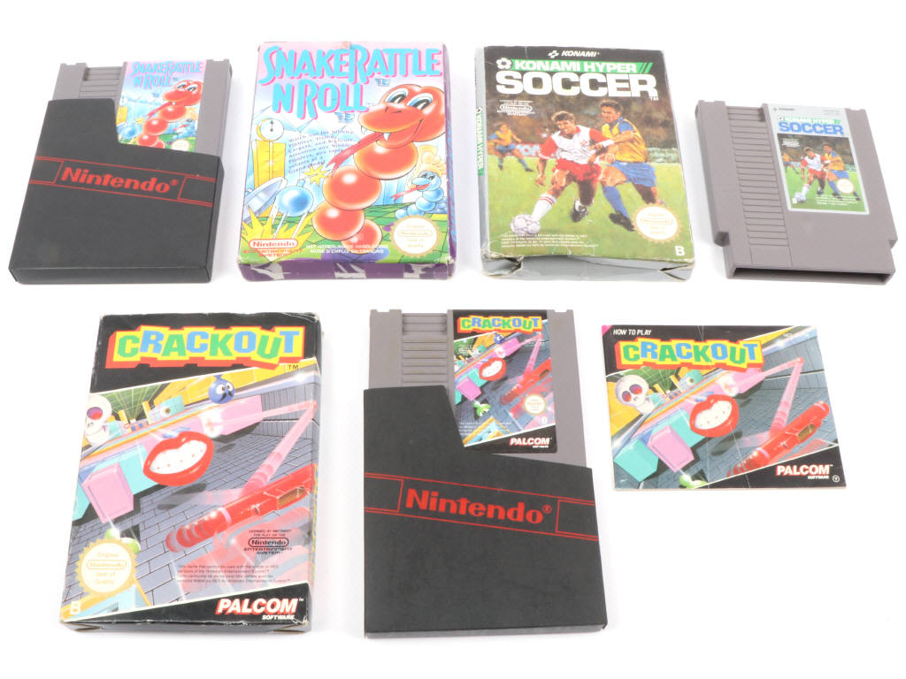testé (fonctionnent) : comprend SNAKE RATTLE N ROLL, KONAMI HYPER SOCCER & CRACKOUT (avec mode d'emploi) - boites avec manques de papier, frottements & petites déchirures