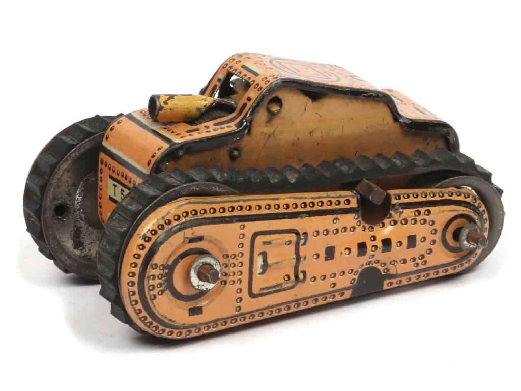 probablement issu d'un moule GAMA ( avec marquage USA Made in occupied JAPAN à l'arrière de la carrosserie) - longueur : 7.5 cm - moteur à clef & mécanisme de pierre à briquet (fonctionnent - pierre usée) - chenilles non d'origine - oxydation par endroits
