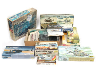 8 modèles jamais ouverts - comprend notamment les modèles : hélicoptère ALOUETTE, GAZELLE, DAUPHIN, COUGAR, FORD THUNDERBIRD & camion FUSO - on y retrouve les marques : HELLER, HASEGAWA & ODK - on y joint un modèle monté en état 'B.c' de la marque REVELL - quelques boites en état 'c' - possibilité de petits accessoires manquants