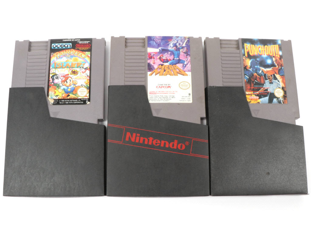 testés (fonctionnent) - comprend : RAINBOW ISLANDS, MEGA MAN & PUNCH-OUT - petits accrocs sur les étiquettes & cartouches encrassées